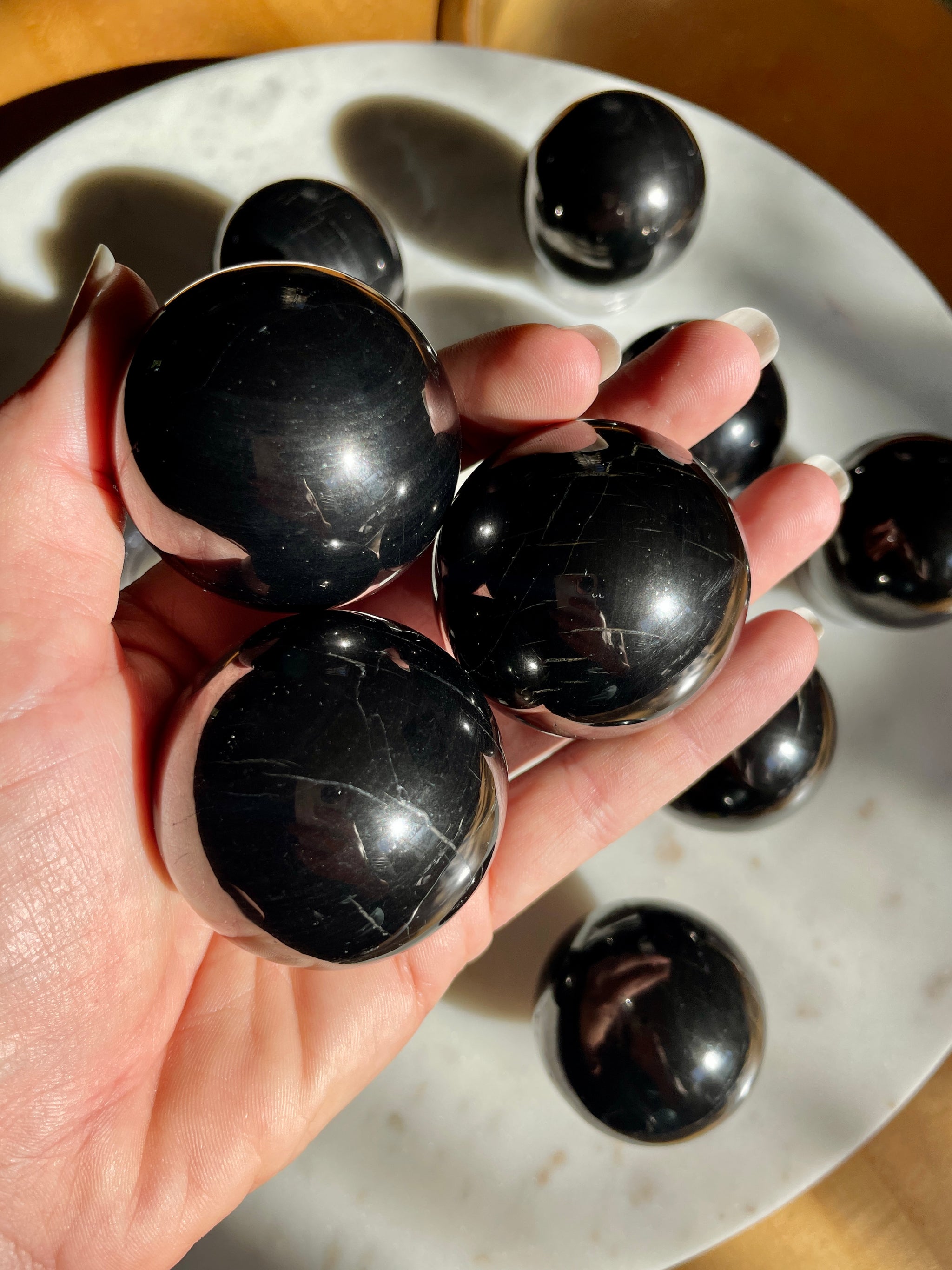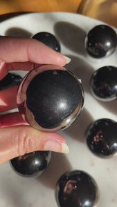 Highly reflective Petrovsky shungite spheres in two different sizes. From Karelia, Russia, this particular shungite contains 70-80% carbon, which is a much higher concentration than traditional shungite (30%). It has a porous structure that absorbs harmful impurities in water. Approximately 2 billion years old. Each sphere will come with an acrylic stand. Select the size sphere you'd like from the drop down menu. I will select your exact sphere but they are all very similar!